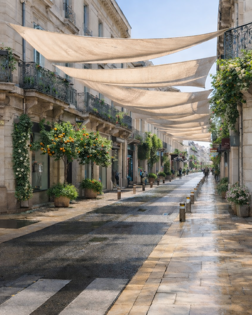 - Voiles d’ombrages dans les rues passantes du centre-ville et brumisateurs